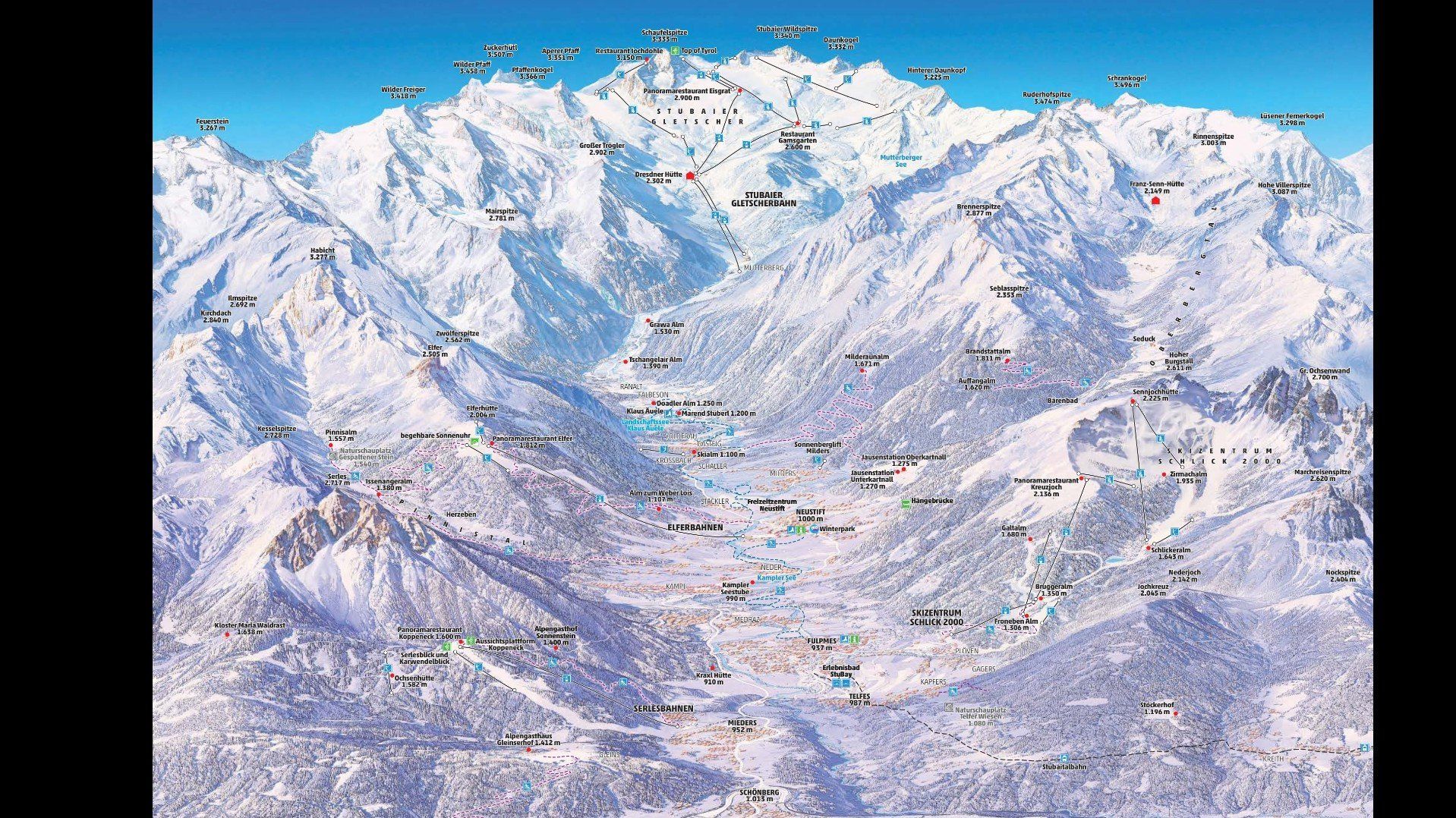 Uno de los puntos fuertes de un día de esquí es sin duda el descenso en el valle de 10 km de longitud desde la estación de montaña de Wildspitz hasta la estación del valle de Mutterberg. La pista de esquí negra "Daunhill" tiene una pendiente máxima del 60%: ¡pura adrenalina! Gracias a los funparks del glaciar de Stubai y de Schlick 2000, los amantes del board y del freeski también están bien atendidos.